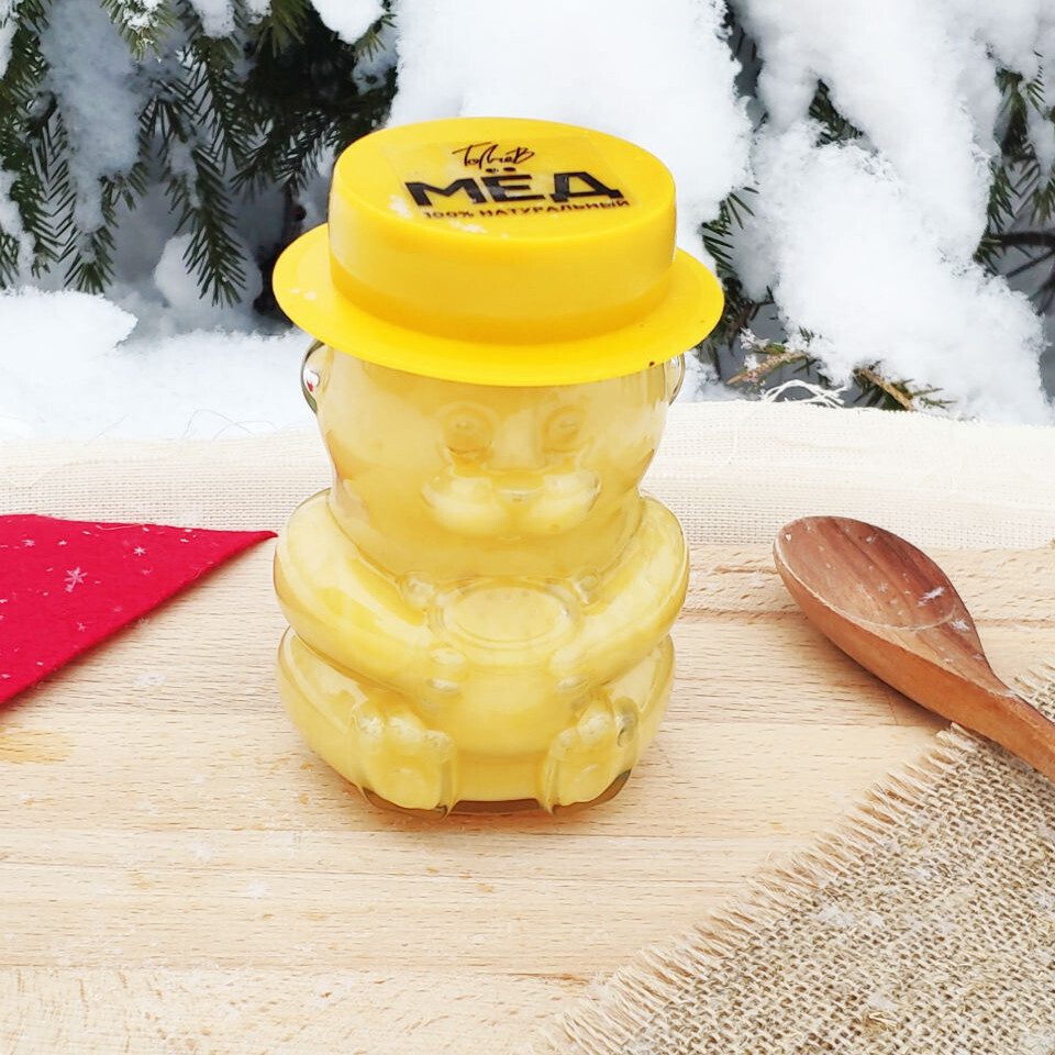 Стеклянная банка крем мёда в форме мишки массой 400 г (0,28 л) подходит для тех, кто любит необычный мёд.